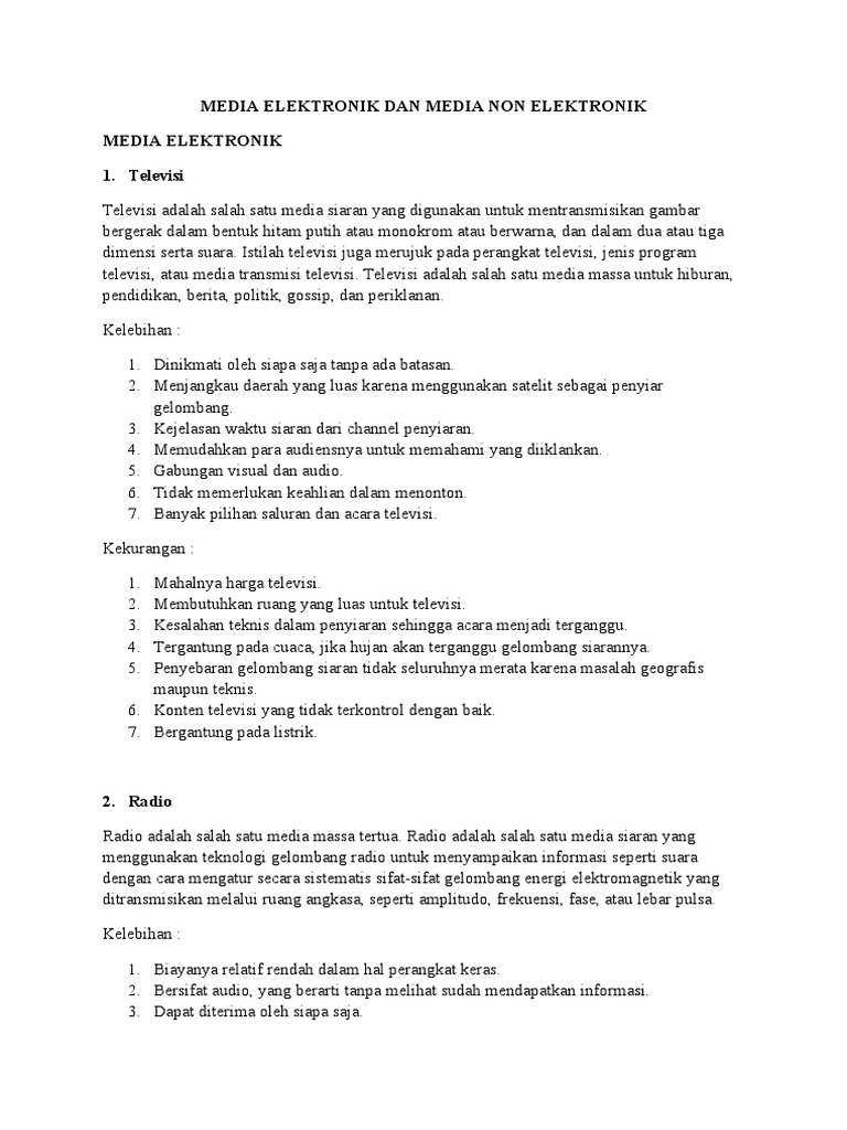 Media Elektronik Yang Menayangkan Iklan Tanpa Visual Adalah : Jenis Jenis Iklan Media Elektronik : Artinya radio adalah media yang mengandalkan pendengaran untuk menyapa pendengarnya.. Radio merupakan media auditif yang bersifat atraktif. Media elektronik mempunyai audio visual yang memudahkan para audiensnya untuk memahami berita, khususnya pada media elektronik televise. Iklan elektronik adalah iklan yang penyebarannya melalui media elektronik. Salah satu tugas dari public relations adalah menempatkan pesan pada suatu media tanpa membutuhkan biaya dan hasil dari penempatan pesan tersebut adalah bonus. Secara umum, iklan dibagi menjadi 2 berdasarkan media yang digunakan.